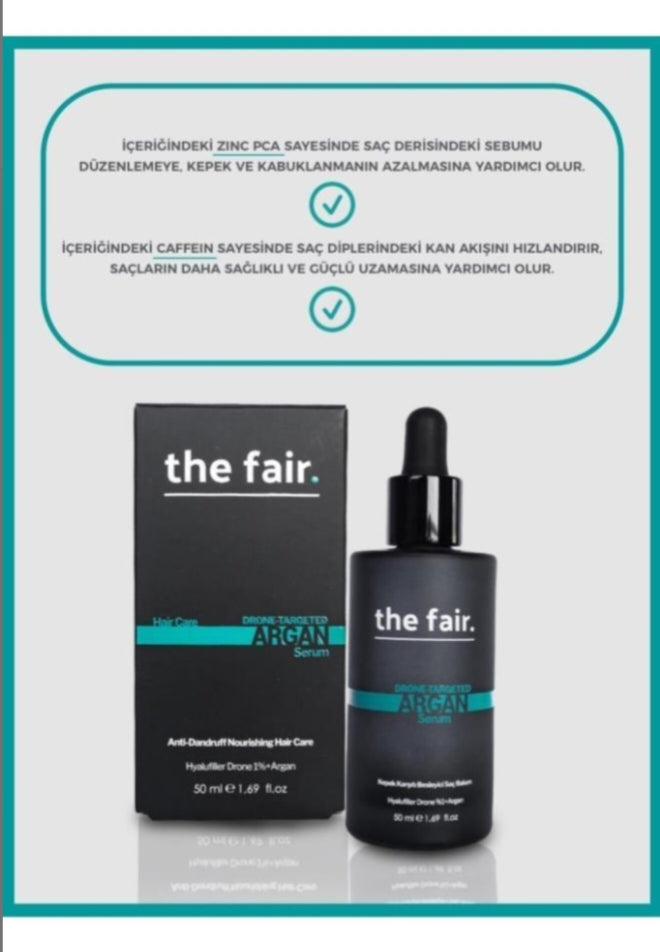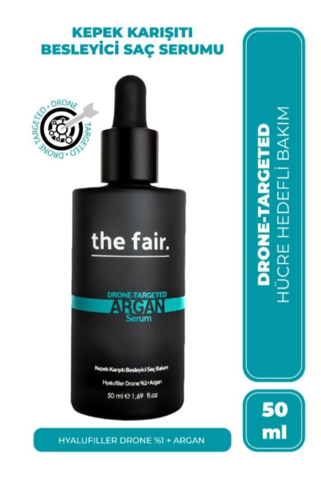 - the fair. Drone-Targeted Argan Vegan Saç Serumu 50 ml Drone-targeted argan serum, hyalufiller drone teknolojisi, argan ile güçlendirilen formülü özel bakıma ihtiyaç duyan saçlar için etkin bir destek sağlar. Arcticum lappa root extract, lavandula angustifolia extract, taraxacum officinale extract, plantago major leaf extract, papaver rhoeas extract, cynara scolymus extract, rosa centifolia extract kompleksi, zinc PCA, vitaminler ve nemlendiriciler ile kepek oluşumunu önlemeye, kökten ucan ve derinlemesine beslenmesine, saç tellerinin güçlenmesine, saçın kaybettiği nemi geri kazanmasına yardımcı olur. Kullanımı : Birkaç damla serumu, parmak uçlarınızla masaj yaparaksaç derisine yediriniz. Düzenli kullanım önerilir. Uyarı : Çocukları erişemeyeceği yerde, güneş ışığından uzakta, kuru ve serin ortamda muhafaza ediniz.İlk denemeyi el bileğinizin iç kısmında denemenizi ve alerjik bir reaksiyonda doktorunuza başvurmanızı öneririz. Haricen kullanılır.
