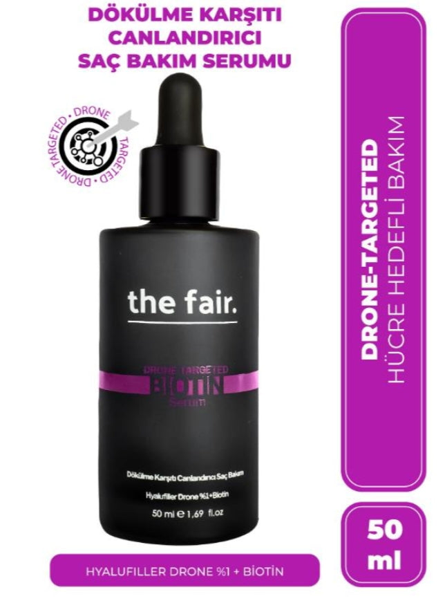 -the fair. Drone-Targeted Hair Biotin Serum 50 ml Drone-Targeted Biotin Serum, Hyalufiller drone teknolojisi, Biotin ile güçlendirilen formülü saç dökülmelerine karşı saçın direncini arttırmayı destekler. Plantago major leaf extract, malva silvestris extract, equisetum arvense extract, althea officinalis extract, trigonella foenum graecum seed extract kompleksi, keratin, biotin ve vitaminler sayesinde kökten uca ve derinlemesine beslenmesine, saç tellerinin güçlenmesine yardımcı olur. Saçın sağlıklı gelişmesine ve saç tellerinin kalitesini arttırmaya yardımcıdır.